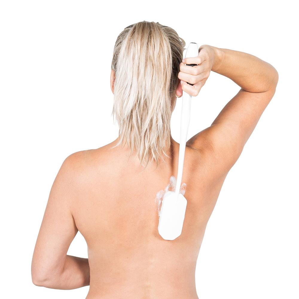 Aanbrenghulp Douchegel De aanbrenghulp kan men gebruiken om zich eenvoudig in te smeren met (alcoholvrije) bodylotion of te wassen met douchegel. Het verlengde handvat zorgt ervoor dat men moeilijk te bereiken plekken op het lichaam kan bereiken, zoals de rug of de onderbenen en voeten. De spons kan apart worden vervangen als deze aan vervanging toe is. Het handvat is voorzien van antislipmateriaal.