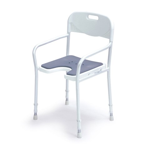 Verstelbare douchestoel met uitsparing en met arm- en rugleuning. Dit is natuurlijk van belang voor een comfortabele zit tijdens het douchen.