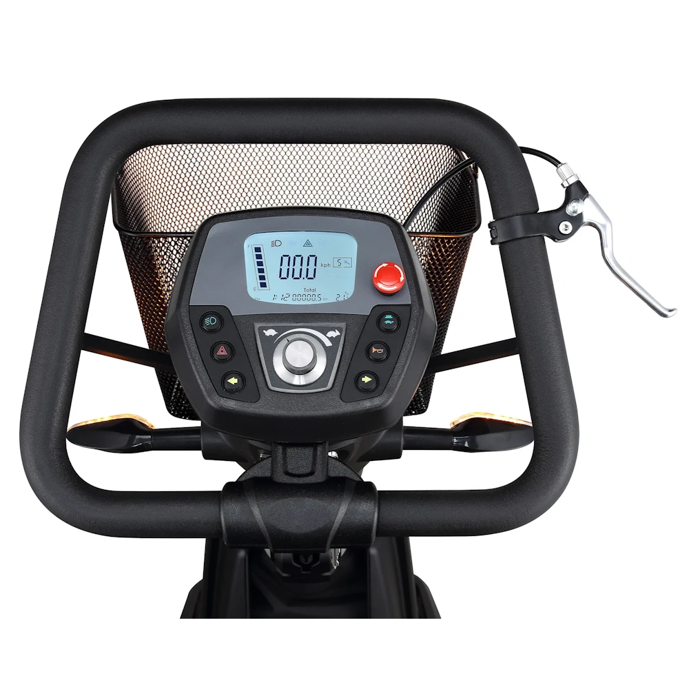 Ergonomisch stuur en wendbare besturing: Het ergonomisch vormgegeven stuur zorgt voor een ontspannen zithouding en een natuurlijke besturing. De directe stuurinrichting maakt het mogelijk om met minimale beweging scherpe bochten te nemen. Dit verhoogt het rijcomfort en maakt de scootmobiel ook prettig in gebruik in stedelijke omgevingen en op smalle paden.