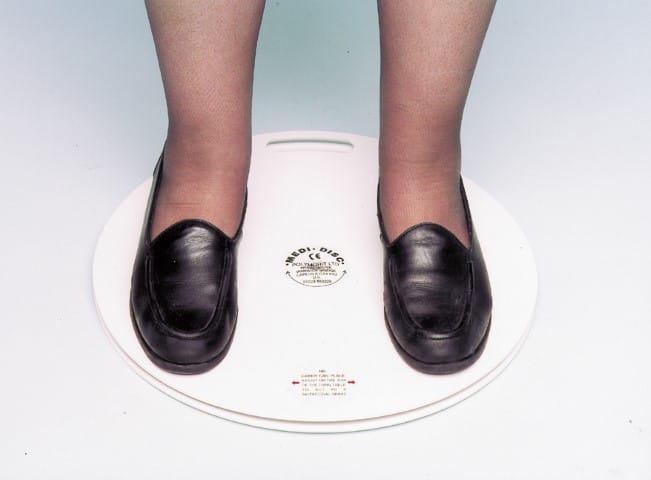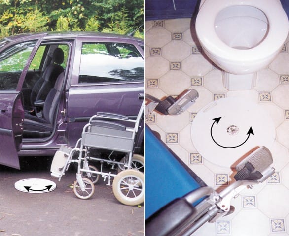 Een lichtgewicht draaischijf voor een vloeiende draaiende beweging tijdens een transfer. De verzorger kan het draaien blokkeren (afremmen) door met de voet de flexibele rand van de schijf licht in te drukken. Voorzien van handvat en een anti-sliplaag aan de onderzijde.