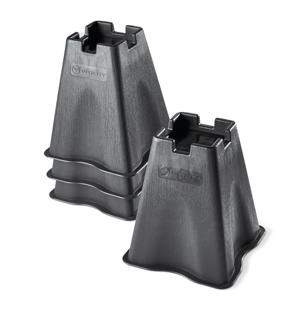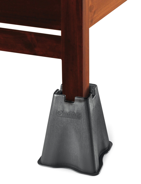 Deze zwarte meubelverhogers van Vitility zijn speciaal ontworpen voor het verhogen van bedden en andere meubels, hierdoor wordt het gemakkelijker om in- en uittestappen. De meubelverhogers zijn er in twee verschillende maten, groot ( 22 cm) en klein ( 7 cm) De meubelverhogers moet onder de poten (afm. Poten max. 10 x 10 cm ) van het bed geplaatst worden. Verder beschikken de meubelverhogers over een anti-slip oppervlak op het gedeelte waarop de poten van het bed geplaatst worden. Het maximale gebruikersgewicht per set van vier is 460 kg.
