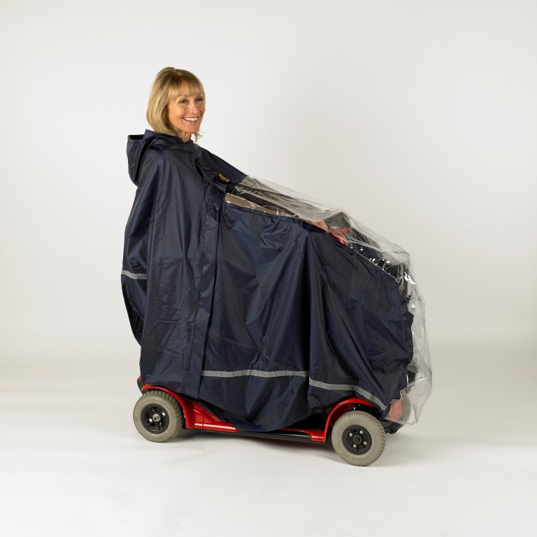 Deze praktische scooter cape beschermt de scooter en de gebruiker tegen neerslag.