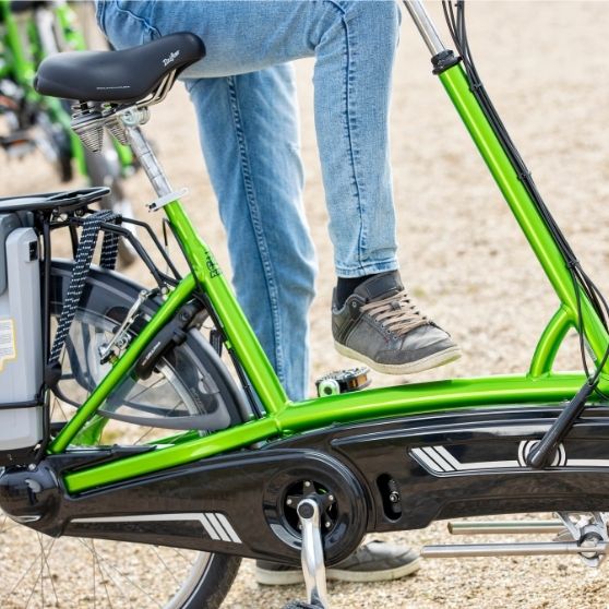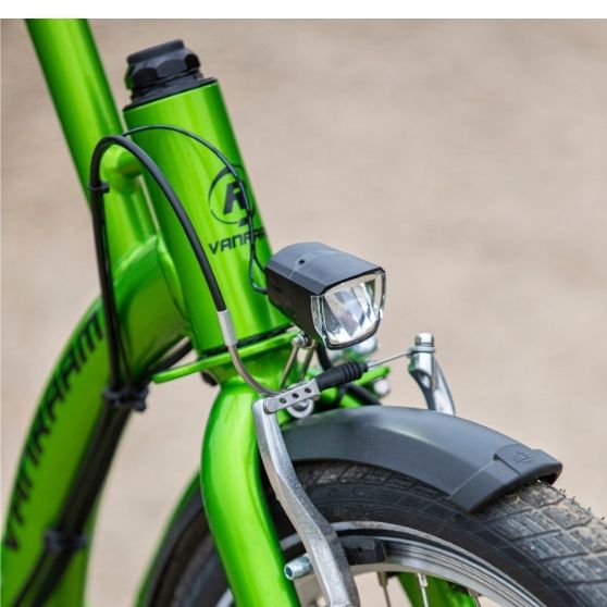 Technische specificaties: Binnenbeenlengte A 77-99 V 55-75 Frame hoogte A 52 cm, V 34 cm Zithoogte Instaphoogte A 44 CM V 38 cm Gewicht fiets +/- 27 KG Max. lengte 242 cm Max. breedte 66 cm Wielmaat voor 20″ Wielmaat achter 26″ Remmen Cantilever rollerbrakes Kleur Appel groen (andere kleur optie )