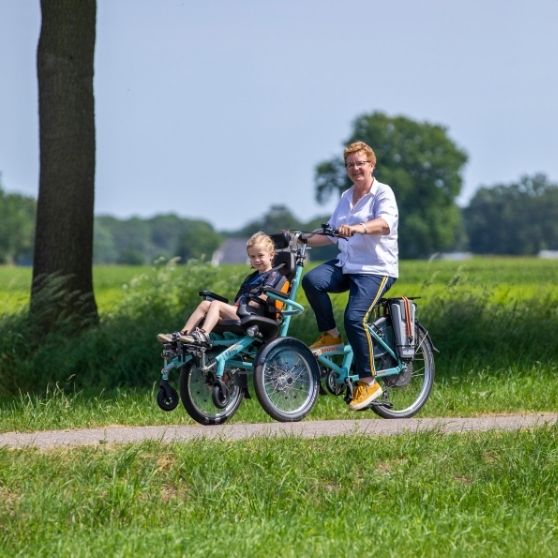 De O Pair rolstoelfiets van Van Raam is een stabiele comfortabele fiets waarmee u en een persoon met een beperking samen kunt fietsen. De O Pair stoelfiets is een duofiets met een comfortabel geveerde rolstoel aan de voorzijde van de fiets. Het grote voordeel is dat bij de deelbare variant het voorste gedeelte gemakkelijk losgekoppeld kan worden van het fietsgedeelte, zodat u dit deel op locatie ook als rolstoel kunt gebruiken. Er kunnen verschillende kuipen op de voorzijde geplaatst worden die aan de specifieke eisen voor de gebruiker kunnen worden aangepast. De licht schuin staande voorwielen geven de fiets extra rijcomfort en stabiliteit. Met een elektromotor heeft u een comfortabele trapondersteuning die het fietsen op deze modern vormgegeven rolstoelfiets nog makkelijker maakt. Er zijn daarnaast nog vele andere opties en accessoires die u O Pair compleet kunnen maken. Tijdens het fietsen op deze rolstoelfiets kunt u goed met elkaar communiceren. Naast de gezonde buitenlucht heeft de fietstocht op deze speciale fiets ook een sociale of therapeutische functie.