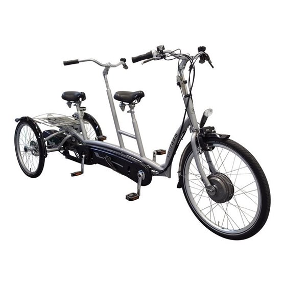 De Twinny Plus driewieltandem van Van Raam is ideaal om samen te genieten van een fietstocht. Op- en afstappen is gemakkelijk bij de Twinny Plus tandem door de ruime, lage instap. Uitgevoerd met twee achterwielen in plaats van één, heeft de Twinny Plus meer stabiliteit. Door deze twee wielen wordt nog makkelijker om op en af te stappen als de fiets stilstaat Er is meer ruimte gecreëerd tussen het zadel van de voorste persoon en het stuur van de achterste, zodat u niet te dicht op elkaar zit. U kunt zelf bepalen hoe u samen fietst, zo kunt u met dubbele vrijloop onafhankelijk van elkaar de voeten stilhouden. Met schakelbare vrijloop kunt u kiezen of u beide in eigen tempo of in gelijk tempo fietst. Tevens kunt u optioneel de besturing ook aan de achterzijde laten monteren. Omdat wij elke fiets uniek produceren kunt u de framehoogte voor en achter naar eigen wens laten aanpassen. De Twinny tandem is ook deelbaar leverbaar. Met een elektromotor heeft u een comfortabele trapondersteuning die het fietsen op deze tandem nog veel makkelijker maakt. Onder andere geschikt voor: Mensen die moeilijk zelfstandig aan het verkeer kunnen deelnemen, waarbij een of beide personen moeite hebben met de stabiliteit en beweging en sociaal contact belangrijk vinden.