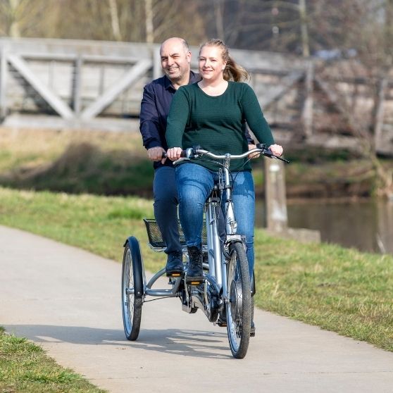 De Twinny Plus driewieltandem van Van Raam is ideaal om samen te genieten van een fietstocht. Op- en afstappen is gemakkelijk bij de Twinny Plus tandem door de ruime, lage instap. Uitgevoerd met twee achterwielen in plaats van één, heeft de Twinny Plus meer stabiliteit. Door deze twee wielen wordt nog makkelijker om op en af te stappen als de fiets stilstaat