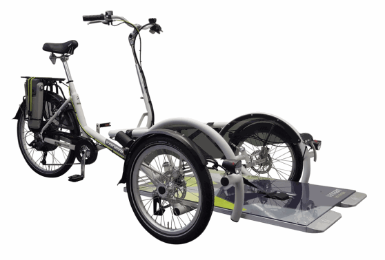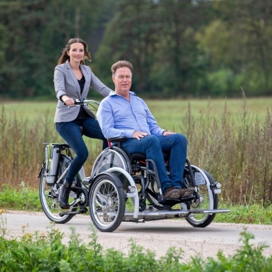 De VeloPlus rolstoelfiets van Van Raam is speciaal geschikt voor rolstoelgebruikers die in hun eigen rolstoel blijven zitten tijdens het fietsen. De handige, kantelbare oprijplaat maakt het mogelijk de rolstoel eenvoudig op de rolstoelfiets te krijgen. Met de makkelijke en veilige vergrendeling is de stoelfiets snel gebruiksklaar. De speciale constructie zorgt voor een stabiele wegligging en een comfortabel gebruik. Op de VeloPlus passen de meest uiteenlopende rolstoelen en daardoor is de rolstoelfiets ook uitstekend geschikt voor instellingen of tehuizen. Tijdens het fietsen kan er goed gecommuniceerd worden. Dit maakt de fietstocht ook sociaal en therapeutisch. De rolstoelfiets is leverbaar met verschillende opties. Met een elektromotor heeft u een comfortabele trapondersteuning die het fietsen op deze modern vormgegeven driewielfiets nog makkelijker maakt.